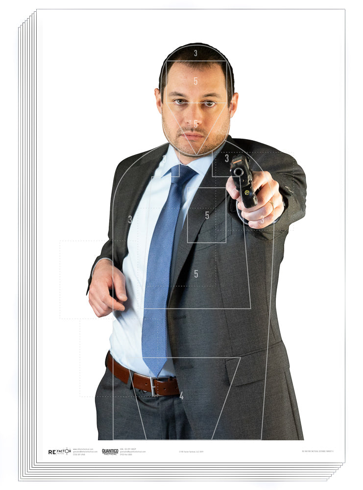 The Defense Target II is designed to give you an enhanced training experience by offering one target that can be customized with multiple stickers. The Defense Target II features an individual that can transform from an FBI agent to an office active shooter to a business no-shoot with the simple change of our customized stickers. This allows the target to be used in multiple different scenarios. Available sticker areas include: