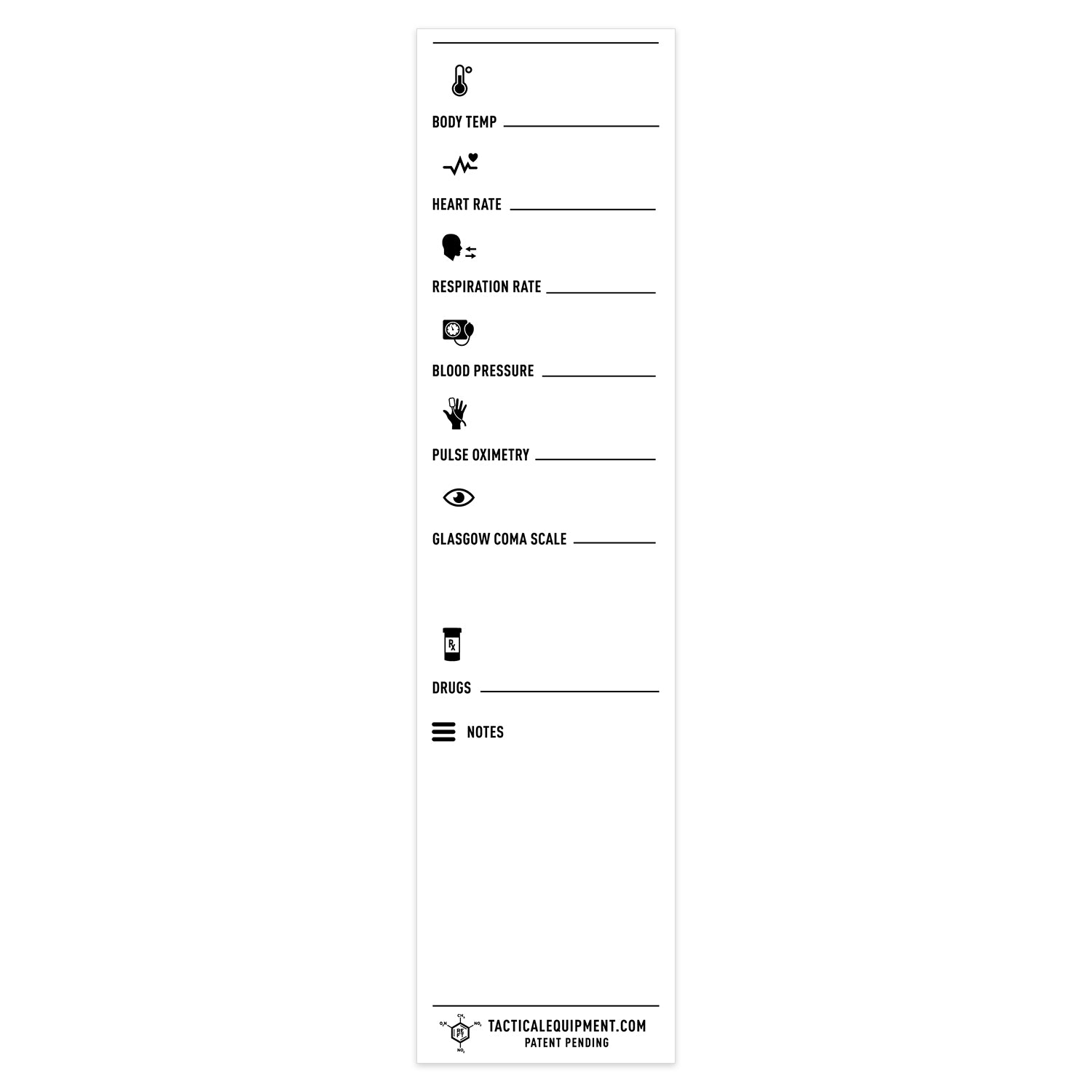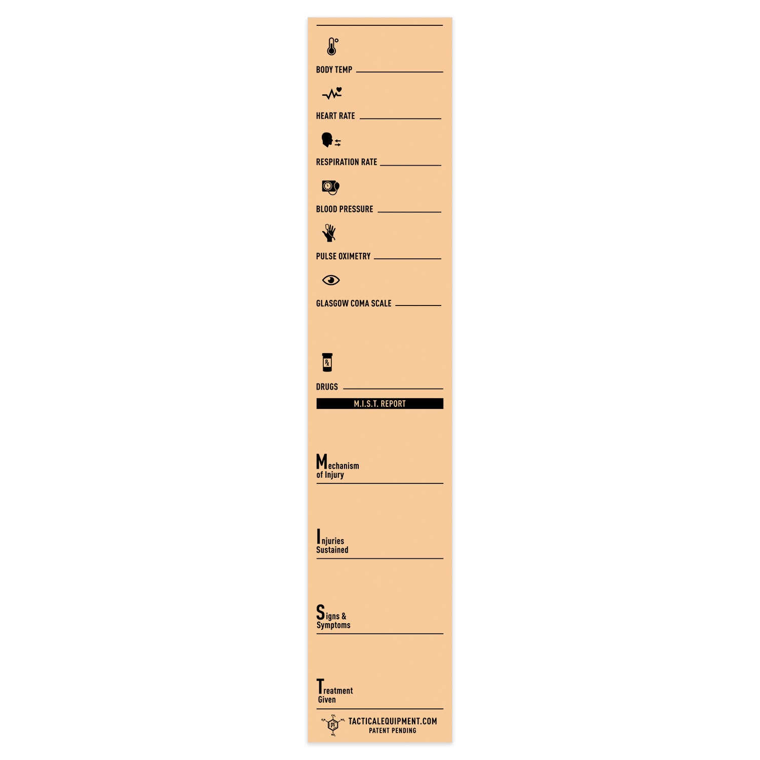 The patent-pending Trauma Tape™ is medical tape designed to provide both medical First Responders and military personnel with a simple layout for recording casualty vital signs and medical information. Printed on 2" 10-yard standard athletic tape allows for vital information, such as body temperature, heart rate, and blood pressure to easily be attached to the casualty as they are moved to different locations. The military edition also includes a M.I.S.T. report for use in combat environments. The white standard roll contains 60 strips and the tan military edition contains 40 strips.