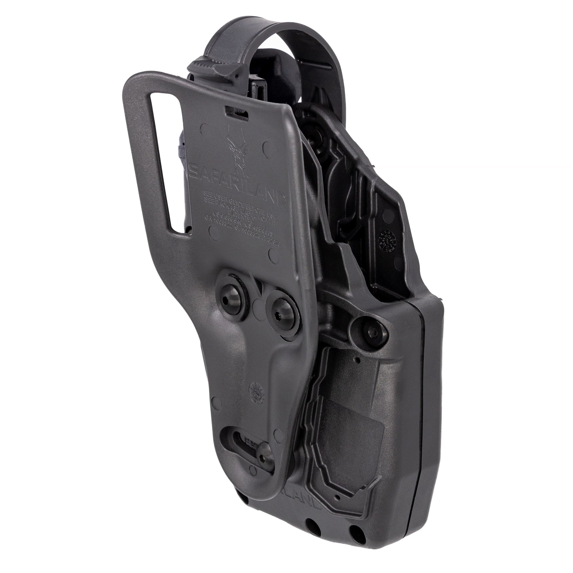 SafariVault - The strongest holster body Safariland has ever built. Its increased structural integrity withstands higher forces and impacts from any direction. SafariVaults improved ALS design reduces flex and increases crush resistance. The all-new self-clearing optic cover accommodates closed and open emitter pistol optics, while a magnetic holstering guidance system stabilizes the slide while holstering. The intuitive design speeds up time to target and ease of reholstering. SafariVaults open muzzle design provides clearance for threaded barrels or compensators and allows debris or brass to pass through.