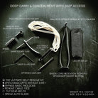 Designed for rapid access in front- or rear-restraint situations, the SRK360 is worn inside the waistband (4 or 8 o’clock position) with the shock-cord tether positioned for immediate extraction. The breakaway female connector can be secured to an IWB strap (not included) using a micro cable tie, keeping the kit stable and hidden until deployment.