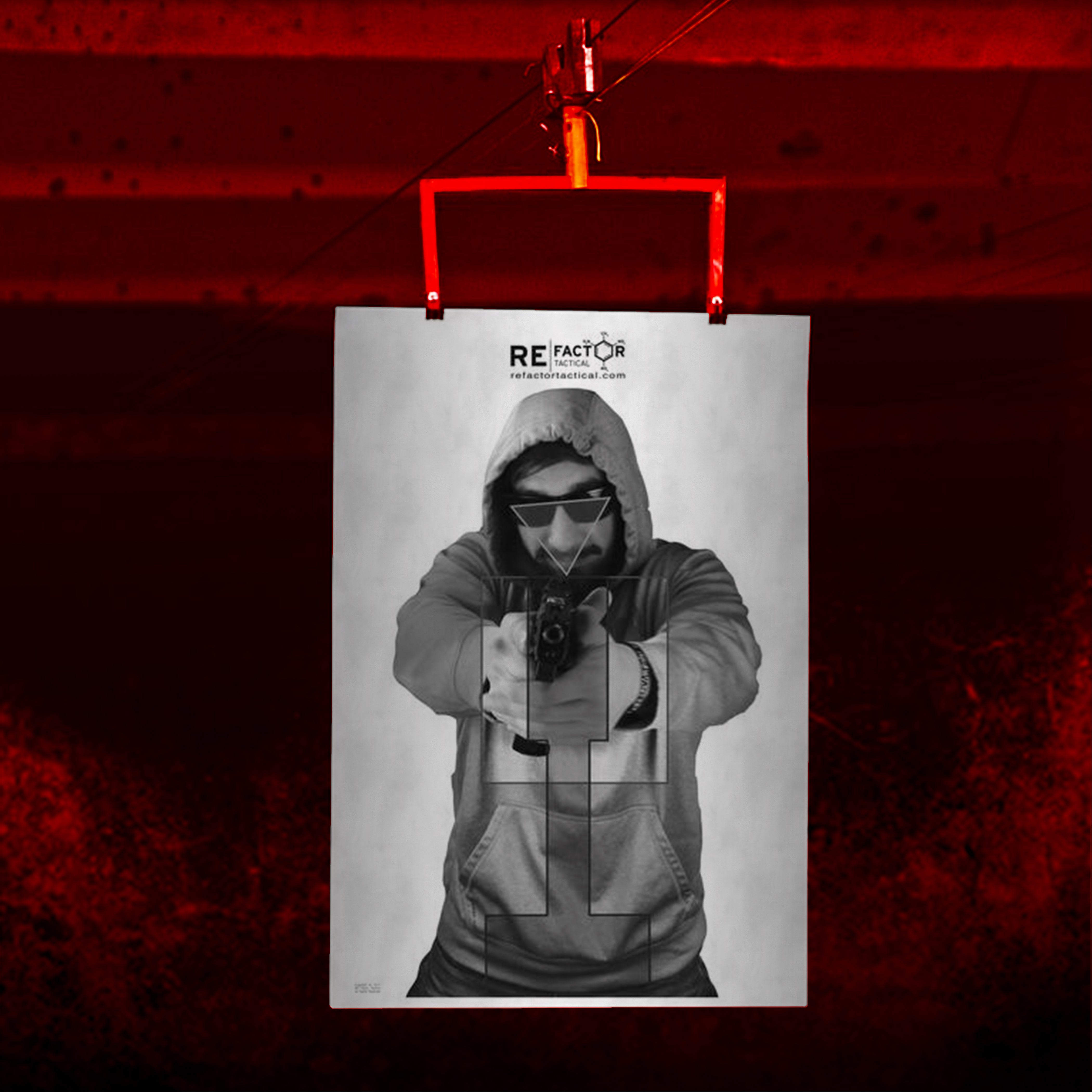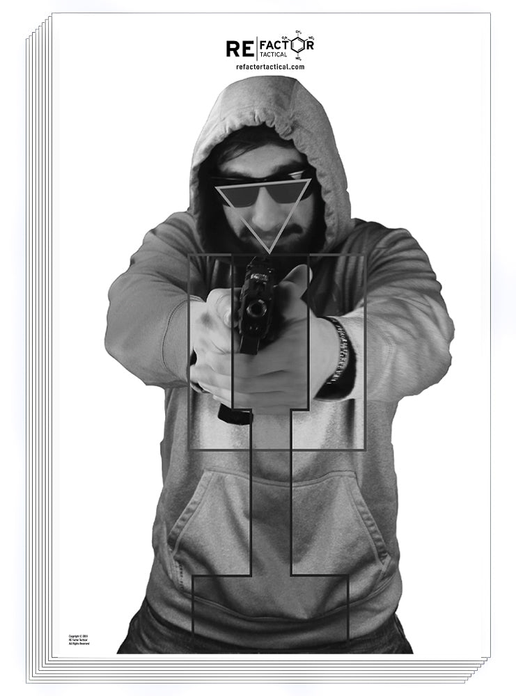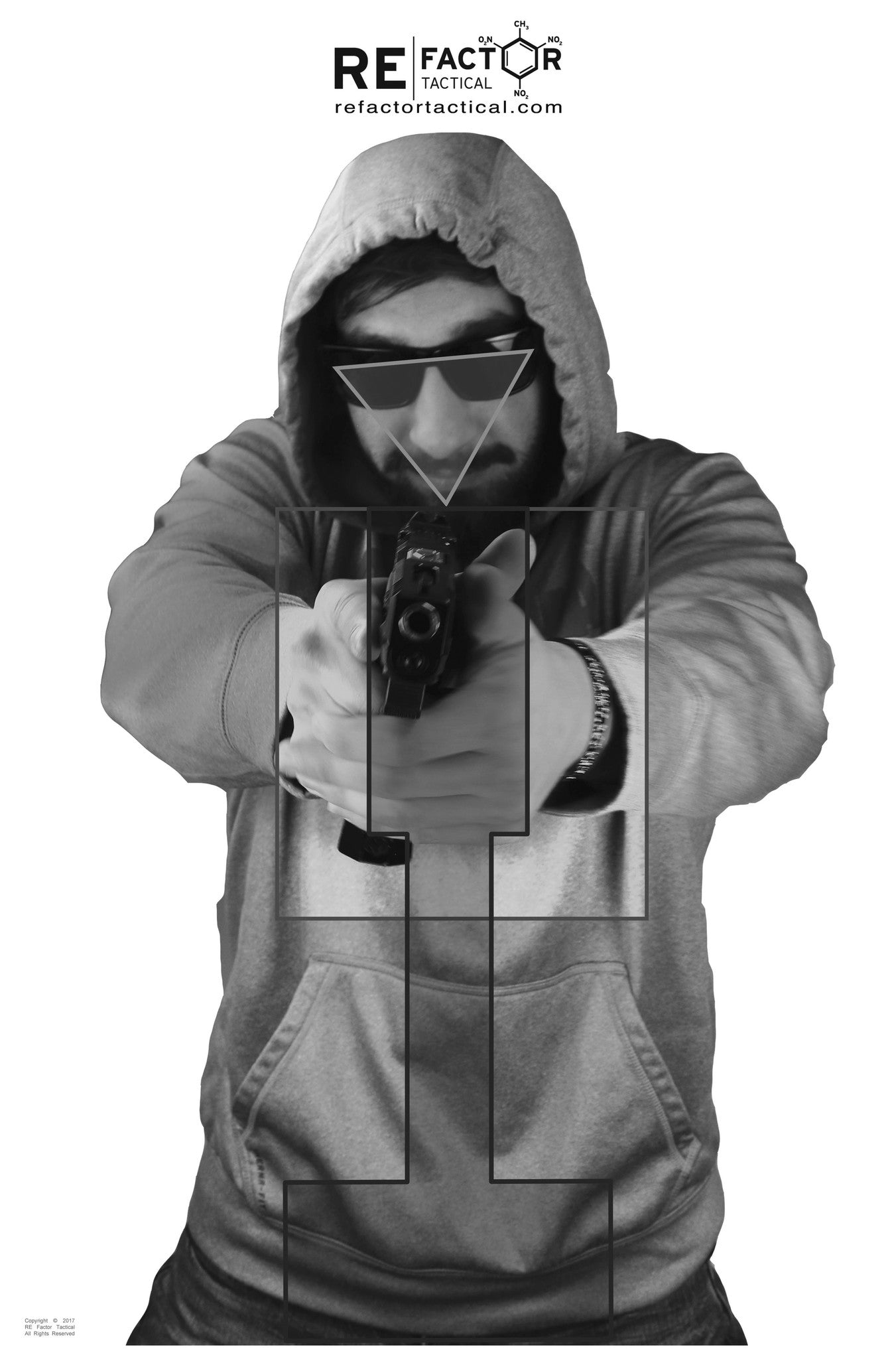 The Active Shooter Target pictures an armed and nefarious individual used for self defense and close-quarters training. The target has vital zone boxes to help shooters visualize key locations of effective shot placement.