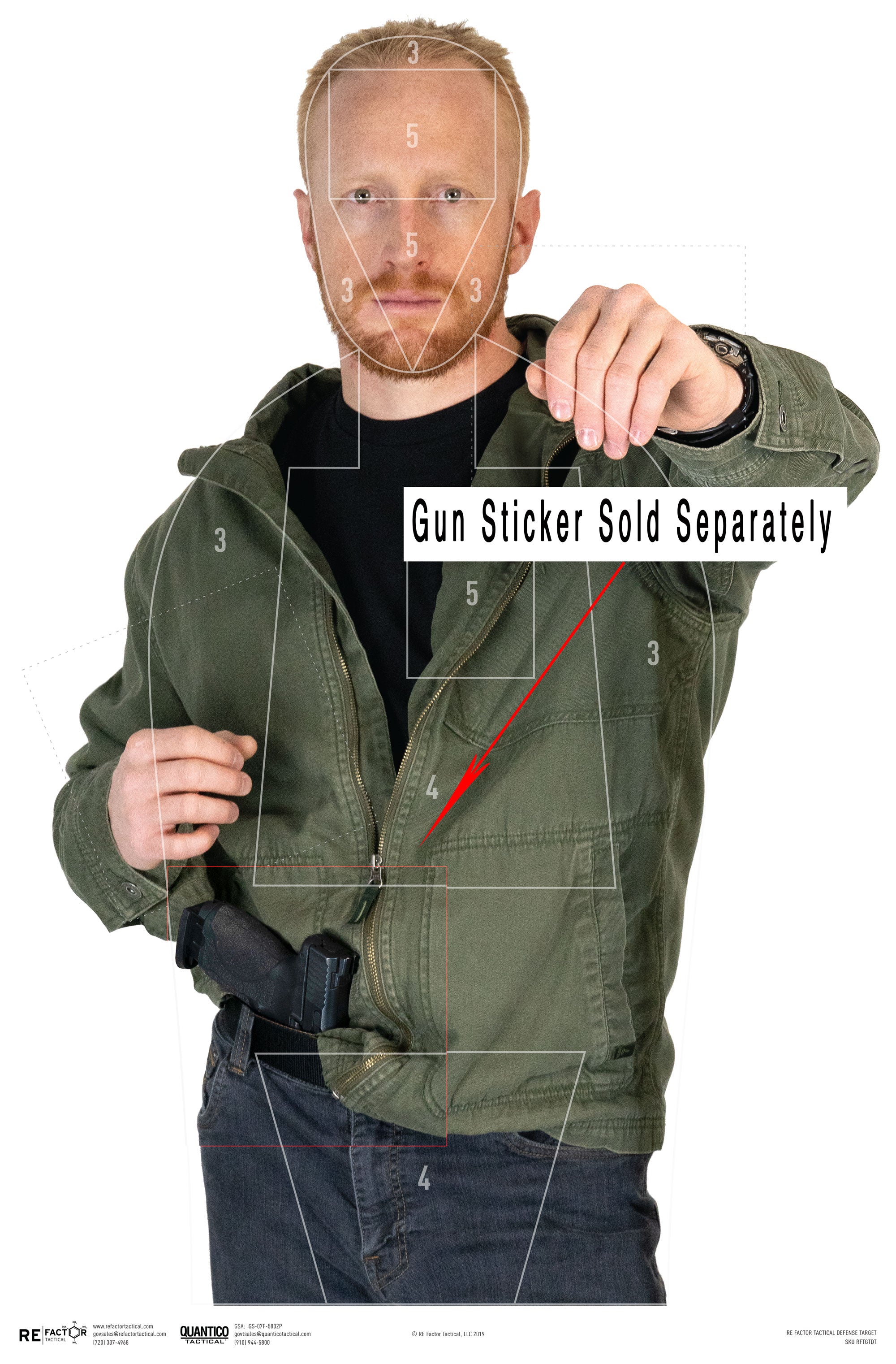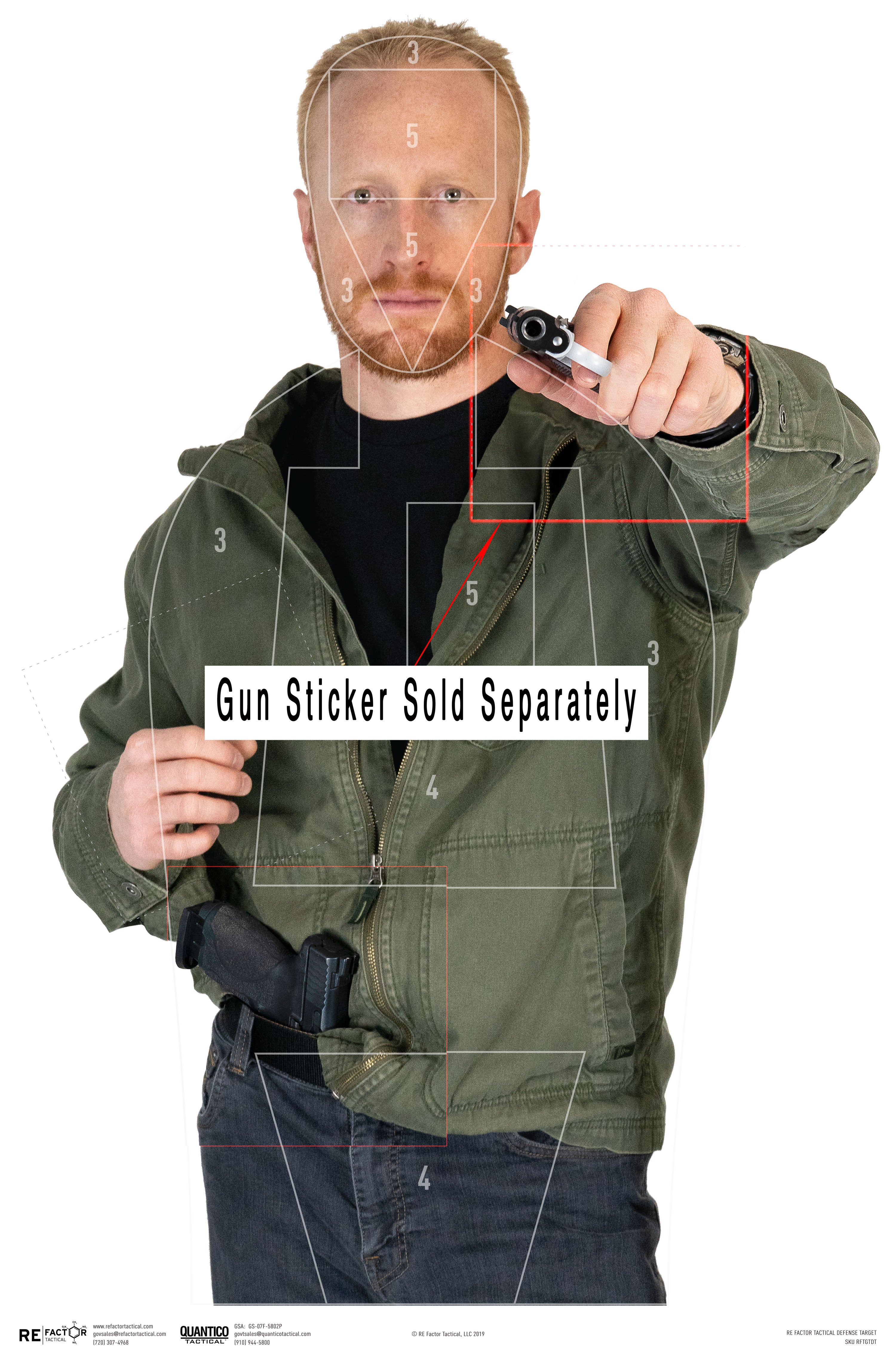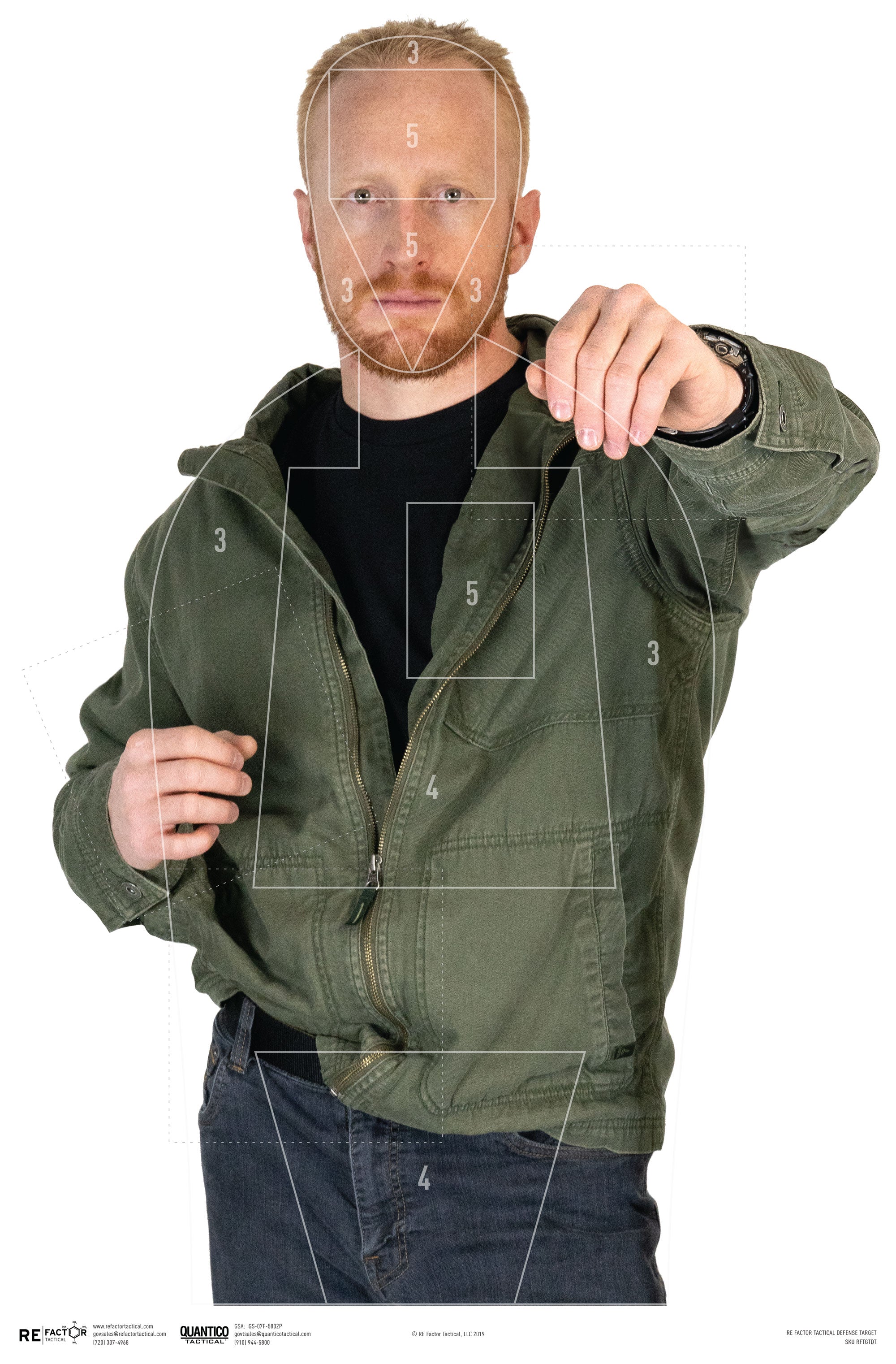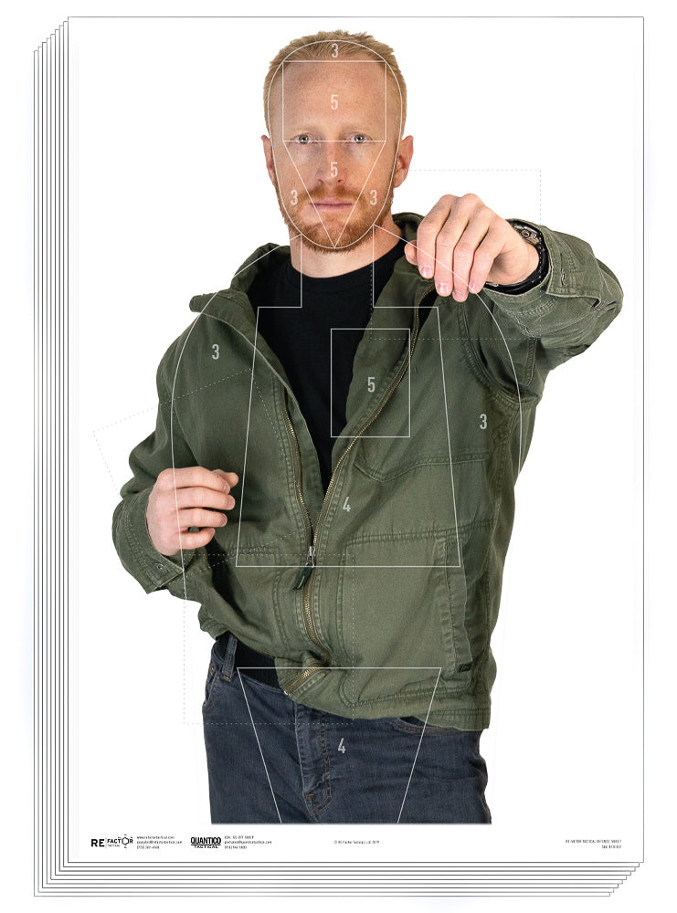 The Defense Target's scoring areas are designed to be as close to the average human's anatomy as possible. The "5" head box measures the average width and height of a human head while the "5" heart box is purposefully offset slightly right (target's left) and sized to the average human heart. Both "5" areas are designed to mimic a kill zone. The "4" zones match the average lung size and pelvic girdle area and are designed to mimic a shot in which death is probable but not guaranteed. The "3" represents the outline of the average human body and represents an area where death is possible but not likely.