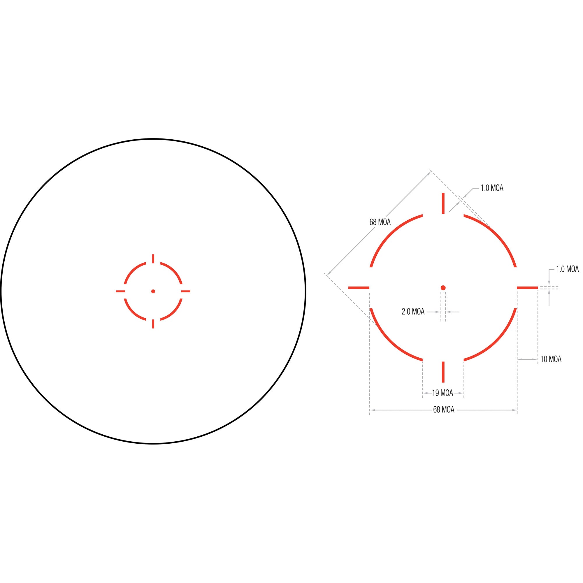 The Trijicon Miniature Rifle Optic (MRO) is a reflex-style, sealed sight intended for use on rifles, carbines, and shotguns to provide fast target acquisition. It is designed to be used with both eyes open, providing the operator with maximum situational awareness. The large aperture and tapered light path maximizes the viewing area in such a small optic, allowing for fast target engagement - especially from non-standard shooting positions. It also features ambidextrous brightness controls, sub-flush adjusters, advanced lens coatings, and a fully sealed, waterproof, hard anodized forged 7075-T6 housing, making the MRO the ultimate mini reflex sight. The MRO HD is optimized for use with a magnifier, with a re-engineered objective lens to produce a refined 2.0 MOA center dot surrounded by a 68 MOA segmented circle reticle. The ambidextrous reticle and brightness control allows the user to choose between a full reticle or center dot only.
