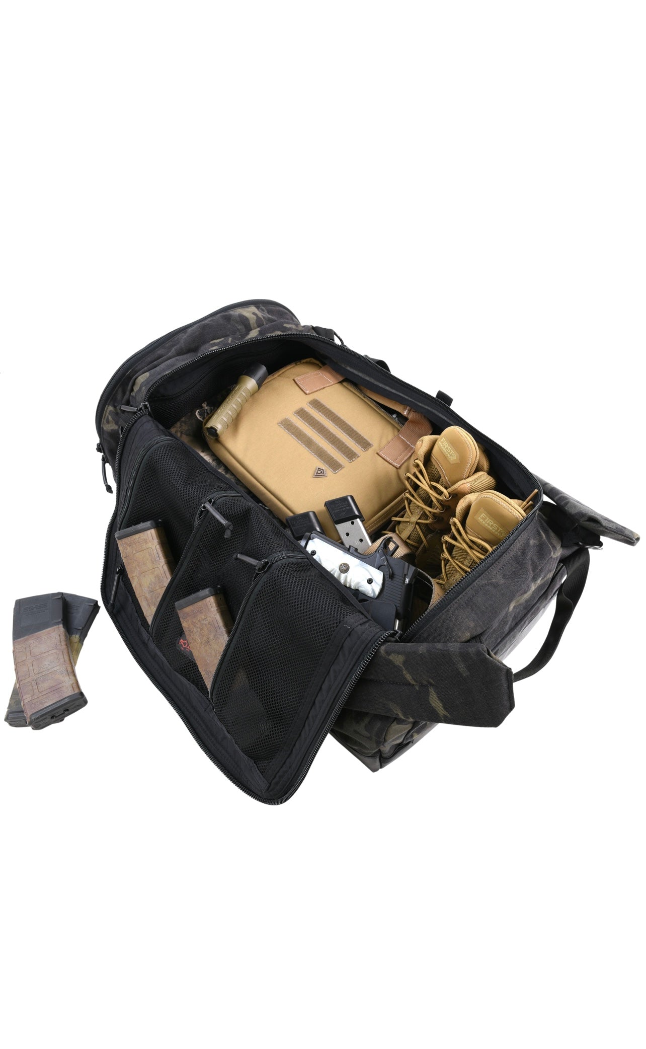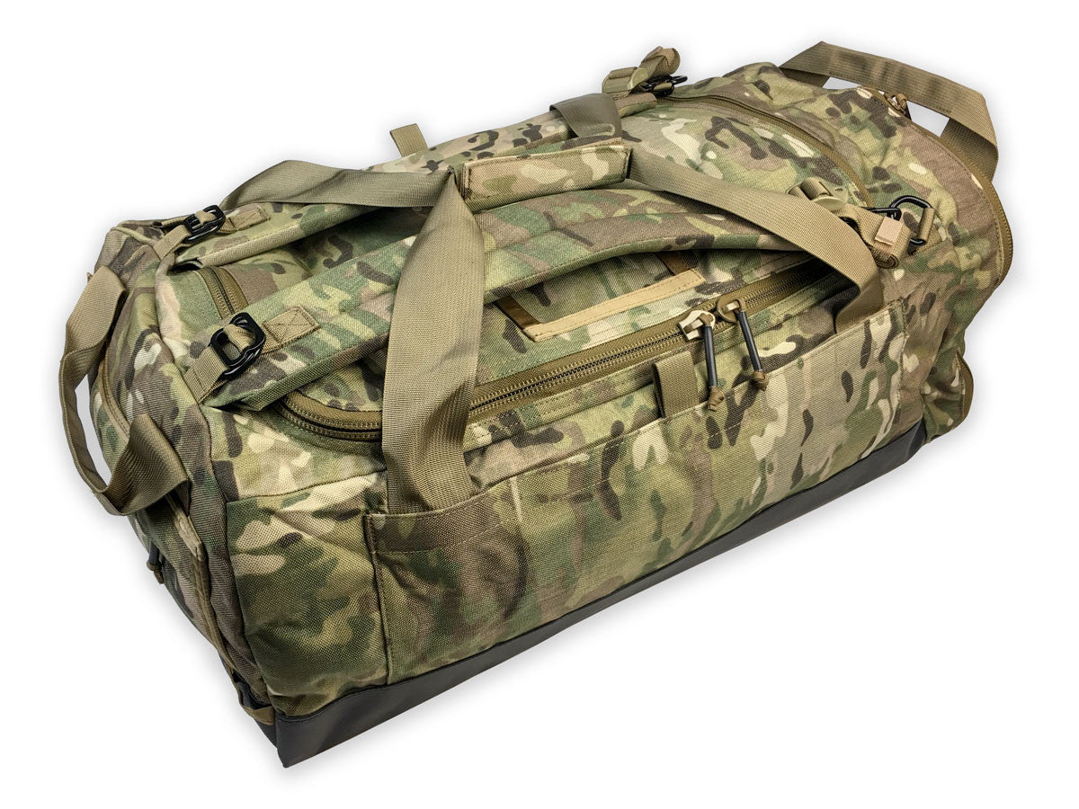 The bottom of the bag boasts our durable waterproof vinyl, keeping your belongings dry in wet conditions. The extra large main opening of the bag is able to accommodate plate carriers, weapons and other oversized equipment. Seven large mesh pockets and a single MOLLE/Velcro panel line the interior for additional organization and storage. Removable backpack straps and integrated duffle straps allow for easy carrying and storage of straps when not in use.