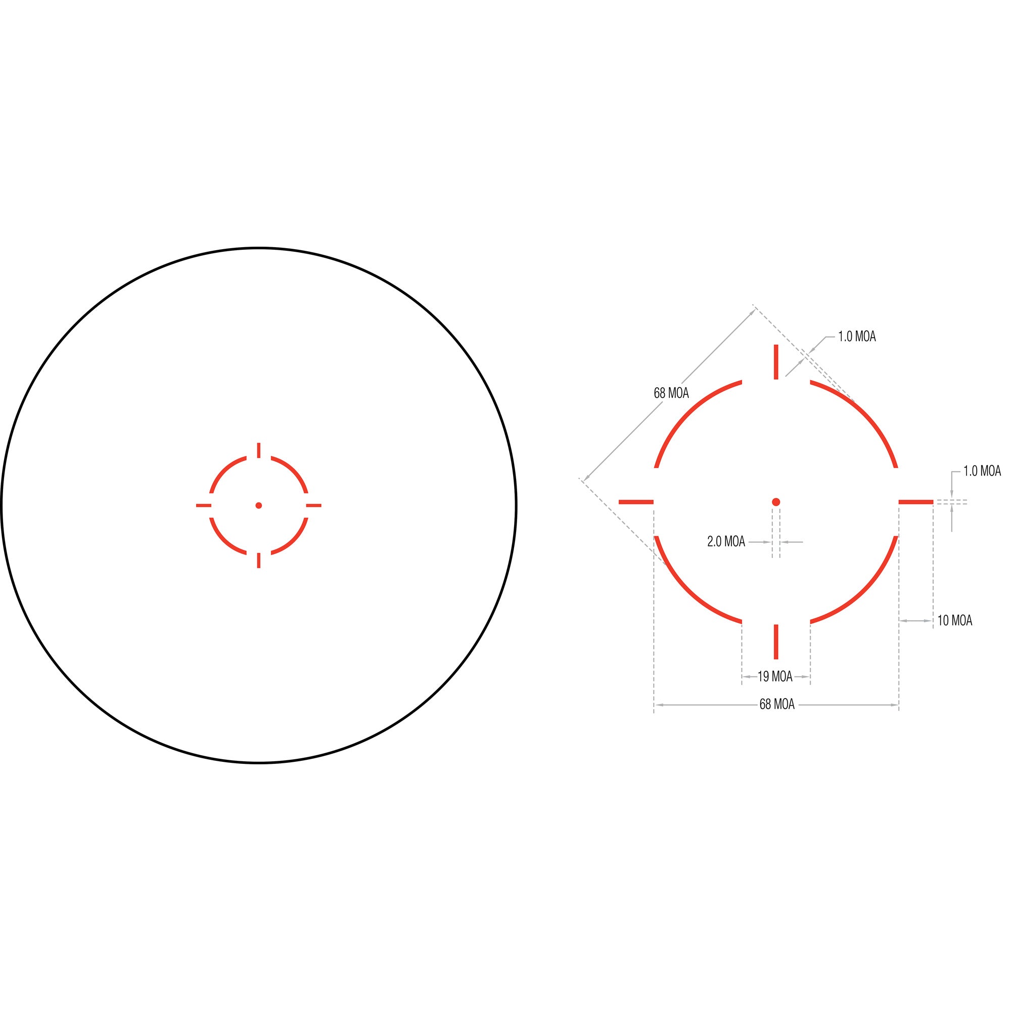 The Trijicon Miniature Rifle Optic (MRO) is a reflex-style, sealed sight intended for use on rifles, carbines, and shotguns to provide fast target acquisition. It is designed to be used with both eyes open, providing the operator with maximum situational awareness. The large aperture and tapered light path maximizes the viewing area in such a small optic, allowing for fast target engagement - especially from non-standard shooting positions. It also features ambidextrous brightness controls, sub-flush adjusters, advanced lens coatings, and a fully sealed, waterproof, hard anodized forged 7075-T6 housing, making the MRO the ultimate mini reflex sight. The MRO HD is optimized for use with a magnifier, with a re-engineered objective lens to produce a refined 2.0 MOA center dot surrounded by a 68 MOA segmented circle reticle. The ambidextrous reticle and brightness control allows the user to choose between a full reticle or center dot only.